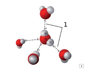 Nella molecola d’acqua ogni atomo di idrogeno si legherà covalentemente (legame forte) ad un solo atomo di ossigeno, e la polarità della molecola rende possibile che l’acqua si leghi ad altre molecole d’acqua od ad altre molecole polari (ossia con cariche positive che attireranno l’ossigeno e negative che attireranno l’idrogeno). Ogni atomo di idrogeno di una molecola d’acqua tenderà a legarsi con legami semplici ad un solo atomo di altra molecola con carica negativa, mentre l’ossigeno, con due cariche elettronegative, né farà due di legami con atomi elettropositivi, l’azoto tre, il carbonio quattro.