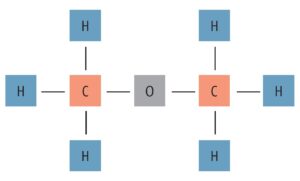 Consideriamo ora la molecola dell’etere dimetilico, CH3-O-CH3, ed esaminiamone i legami: l’ossigeno ha due legami singoli, uno per ogni atomo di carbonio, ogni atomo di carbonio ha quattro legami, tre con l’idrogeno e uno con l’ossigeno centrale.