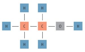 Ora siamo in grado di illustrare l’importanza della disposizione spaziale. Se conserviamo tutti i nove atomi componenti ma li riorganizziamo un po’, come nel caso della molecola CH3CH2OH, si ottiene un insieme radicalmente diverso di proprietà fisiche e chimiche della molecola chiamata etanolo16.