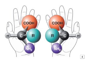 Ad esempio, gli aminoacidi hanno una chilarità nota. In natura, per ragioni ancora sconosciute, quasi tutte le biomolecole preferiscono enormemente una delle due omochiralità (ad esempio aminoacidi e proteine si presentano come mancine). La vita stessa, in un certo senso, “utilizza” fondamentalmente un’omochiralità. La chilarità che viene normalmente vista nelle proteine naturali è quella mancina, come già accennato e la loro versione speculare è quella destrorsa40.