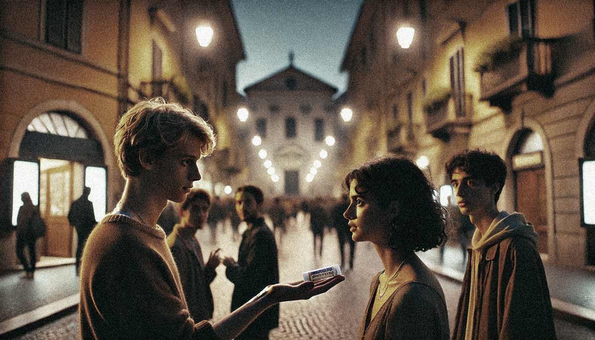 Un ragazzo di un gruppo accanto nota la stessa cosa e si china a raccoglierlo. Guarda attentamente, è ancora chinato e la ragazza ne sente la presenza dietro e si scansa interrogativa, quasi infastidita. Lui si rialza, è magro e piuttosto alto, di capelli chiari. Le porge il tubetto e lei è distratta, non capisce, è mezza girata verso le amiche, ‘Aconitum 5 CH – dice il ragazzo quasi parlando al vuoto– anch’io lo uso, se prendo freddo’, e resta con il tubetto in mano a mezza via, sospeso.